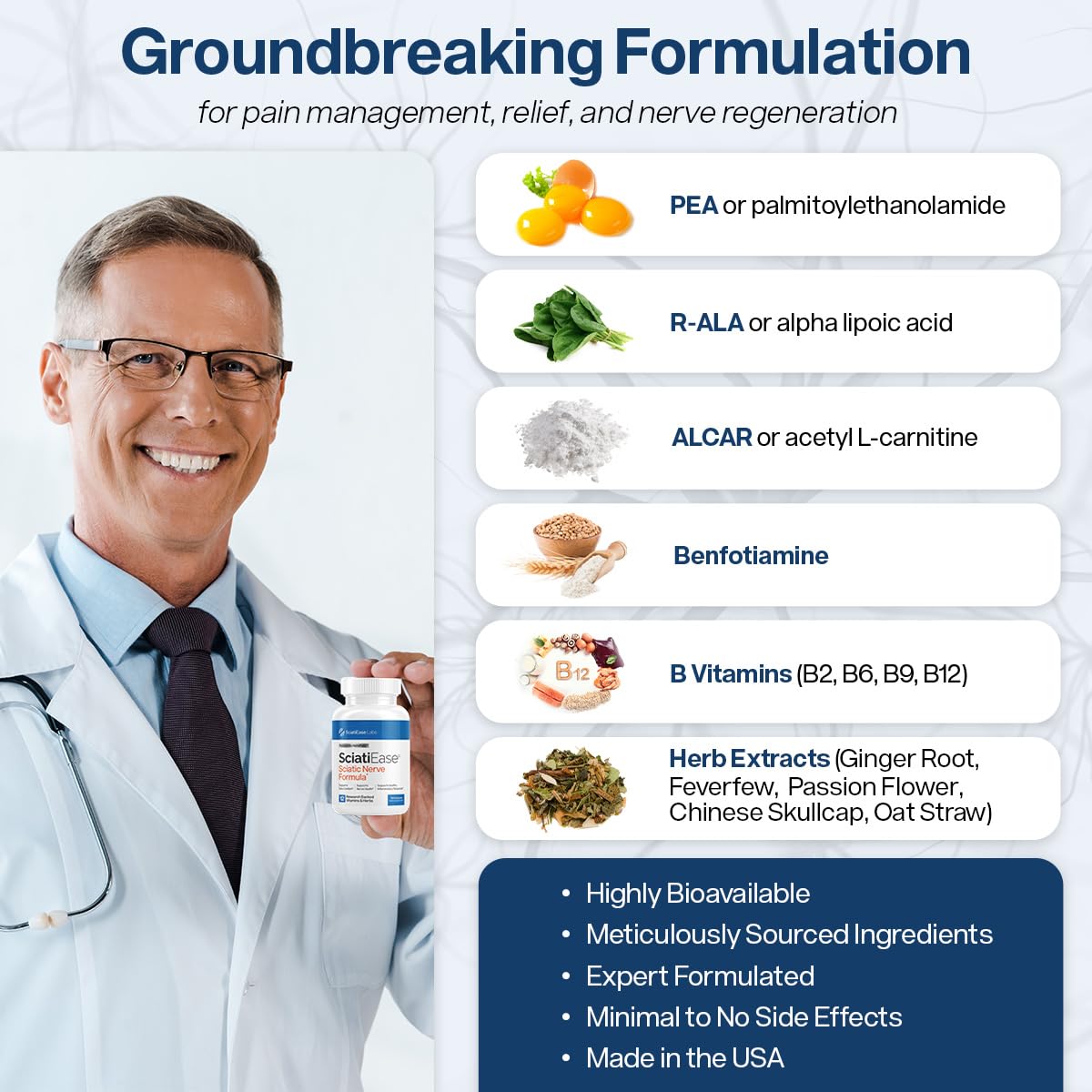 - Science-Backed Super Herbs for Sciatic Relief: Featuring a synergetic combination of feverfew, passionflower, Chinese skullcap, and oat straw extracts, SciatiEase offers a full-strength sciatic nerve formulation. While each one of our ingredients is powerful enough on its own, together, they create a medley of supernutrients that offer maximum rejuvenation.